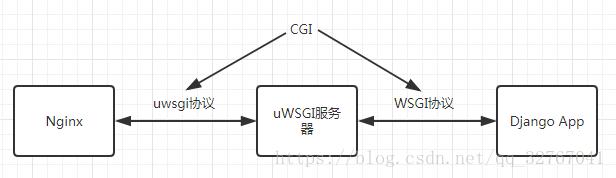 一个Django应用,通过WSGI协议连接uWSGI服务器,uWSGI服务器实现WSGI、http等协议,通过uwsgi协议和Nginx服务器实现http的动态请求和转发以及结果.
