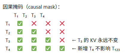 如果是双向注意力(BERT),加一个新 token 会改变所有 token 的表示,缓存全废。这也是为什么 BERT 做不了生成式 AI。